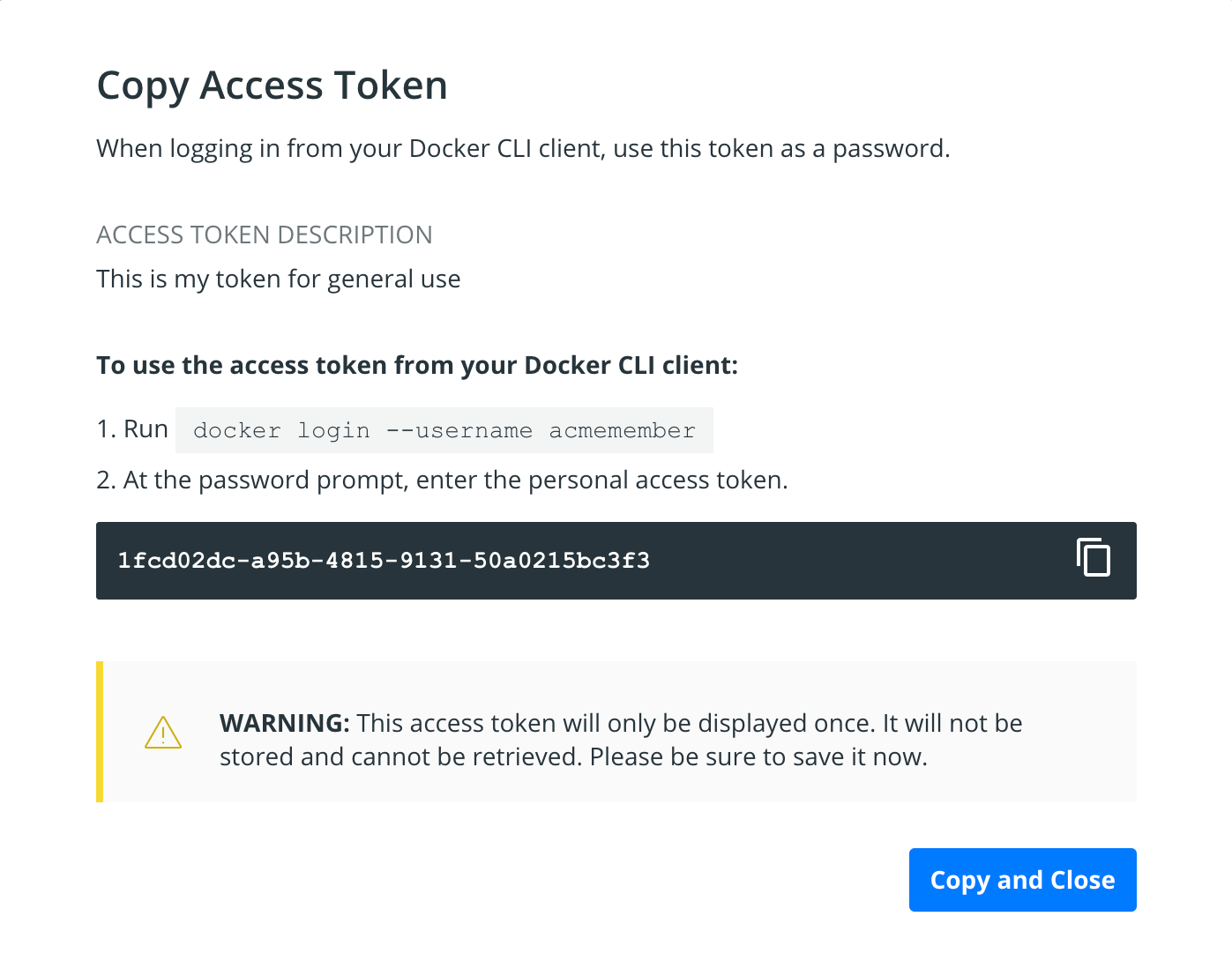 Copy the token that appears on the screen. Make sure you do this now: once you close this prompt, Docker will never show the token again.